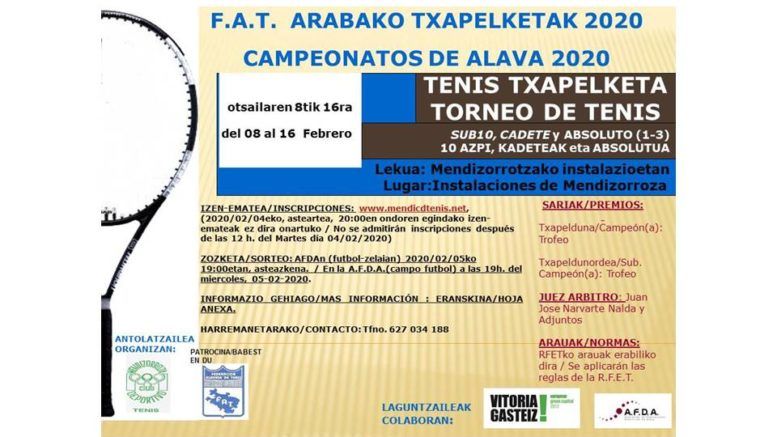 Egun on guztioi, del 8 al 16 de Febrero se van a celebrar en las Instalaciones de Mendizorrotza los Campeonatos de Álava 2020 en las categorías, sub10, cadete y absoluto, masculino y femenino.